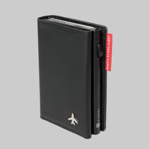 Designed to hold up to 6 cards, which smoothly pop out with the push of a button. It also features a clear ID window, cash compartment, and a sleek, aviation-themed design that stands out in all the right ways.