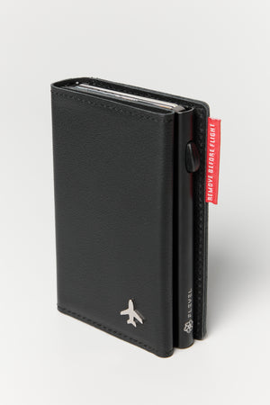 Designed to hold up to 6 cards, which smoothly pop out with the push of a button. It also features a clear ID window, cash compartment, and a sleek, aviation-themed design that stands out in all the right ways.